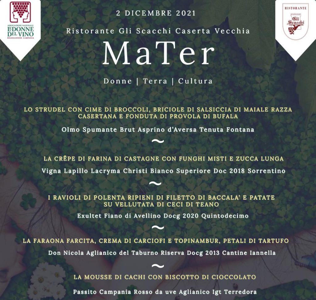 Il 2 dicembre 2021, presso il Ristorante Gli Scacchi di Caserta Vecchia , l’Associazione Donne del Vino della Campania presenta “MaTer: Terra, Donne e Cultura”, una serata di beneficenza che vuole porre l’attenzione sul concetto di “sensibilizzazione”, rivolto alla Terra, alle Donne e alla Cultura della tavola.